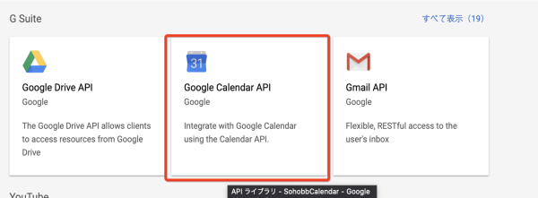 - 作成したプロジェクトを選択し、APIとサービスのダッシュボードからGoogle Calendar APIを検索し、有効にします。