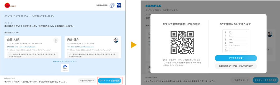 受信者は送られてきたプロフィールを開き、送信者側の情報を確認・ダウンロードできます。相手の情報を送り返してもらうには、「送り返す」ボタンをクリックし、以下の4つの方法のいずれかで返信します。