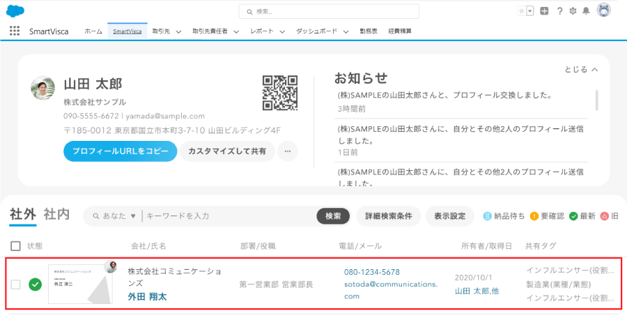 受信者から返信された名刺データはSalesforce内の「SmartVisca」オブジェクトに格納されます。
