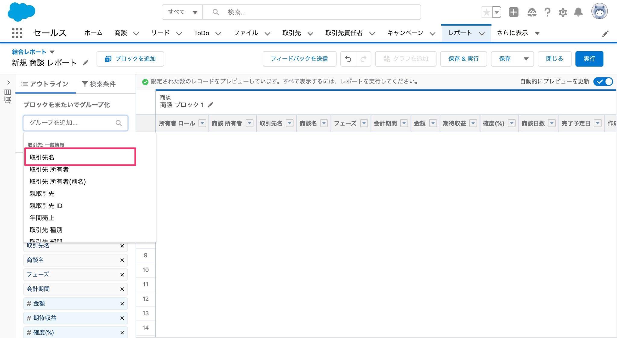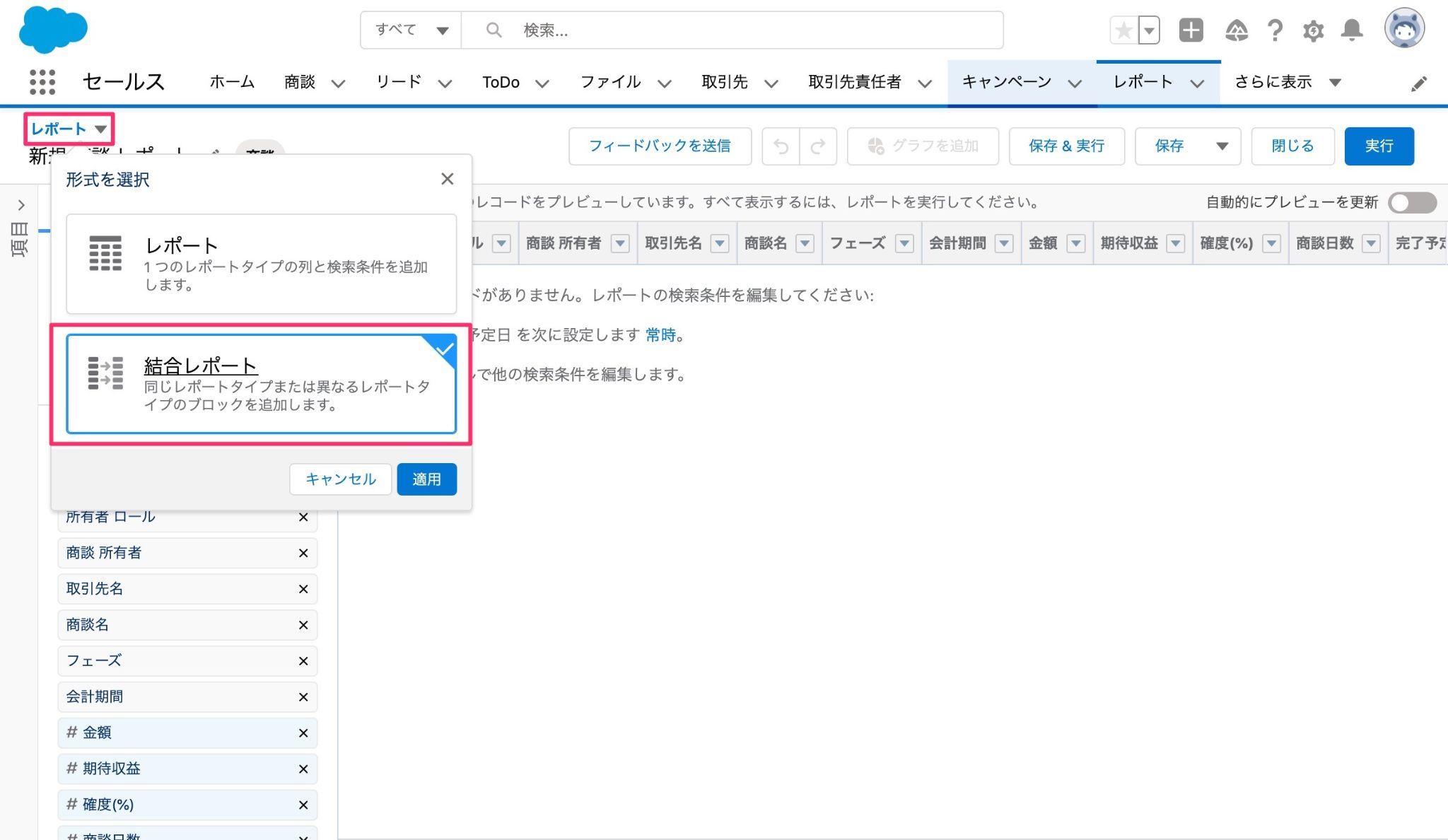 そのため、どちらの方法にも対応できるように、ここではレポート自体の作成手順を省いて、商談タイプのレポートを開いた編集の状態から結合レポートの作成手順を説明します。