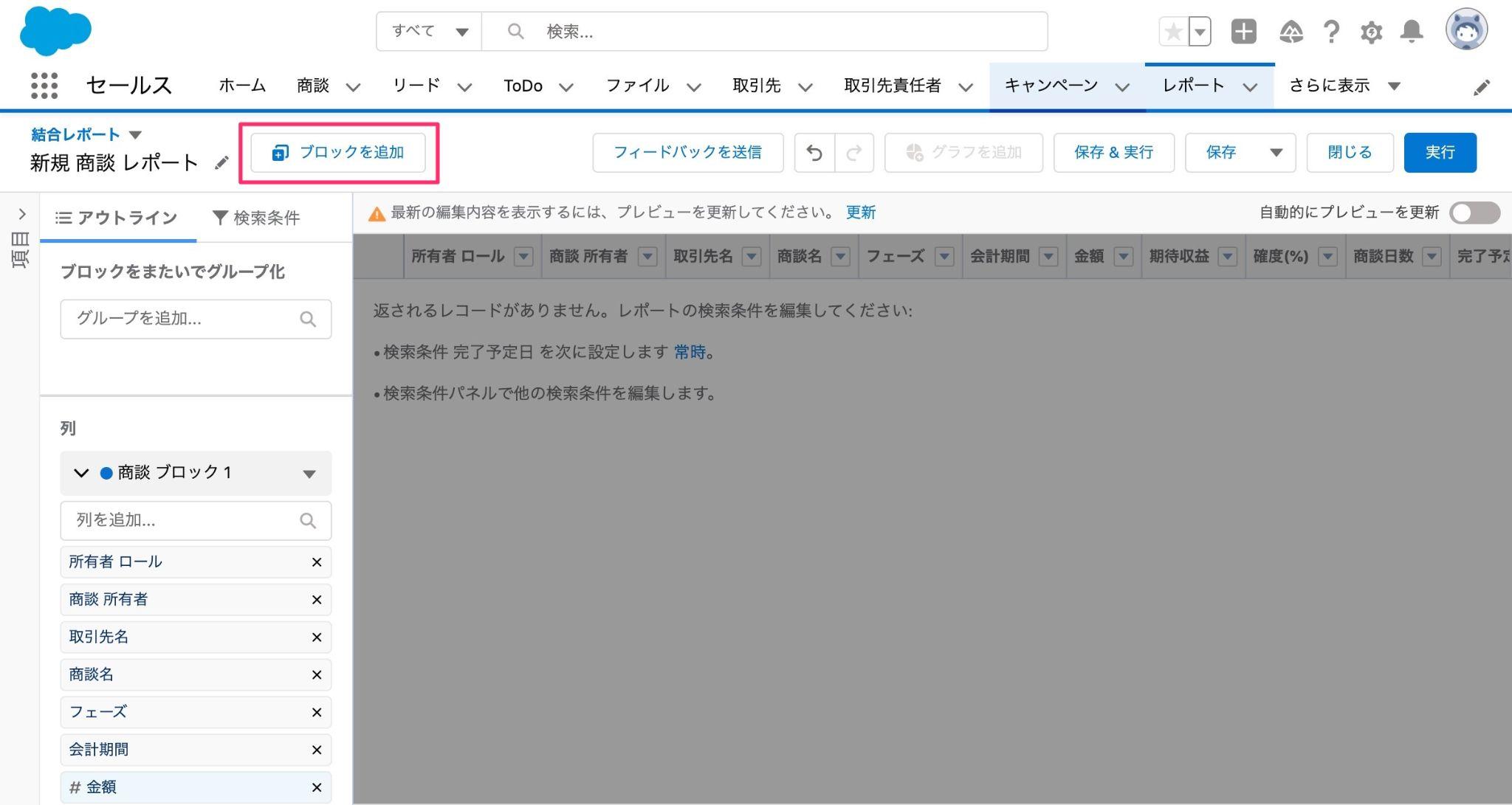 続いて、結合レポートに切り替えることによって現れる[ブロックを追加]ボタンをクリックします。