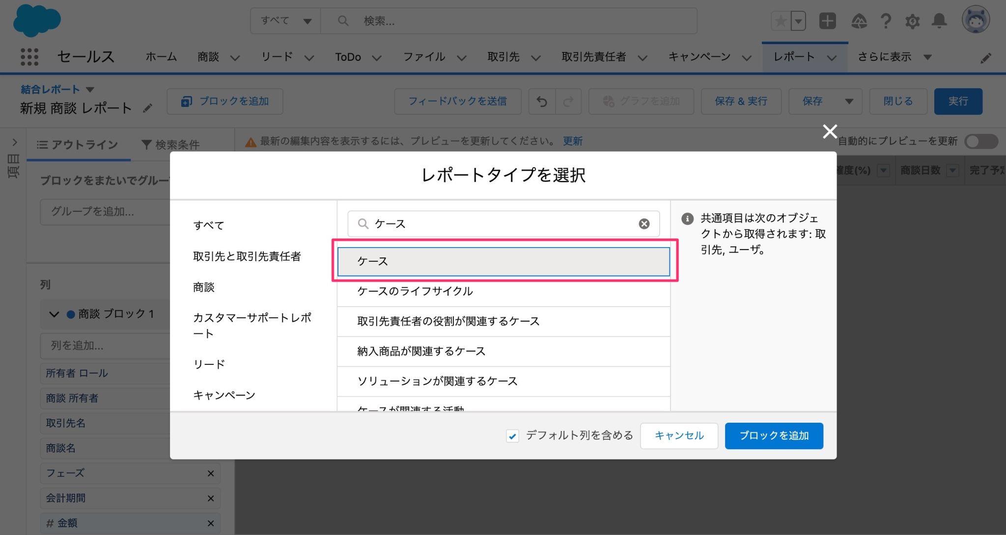 [レポートタイプを選択] のモーダル画面にて「ケース」を選択し、右下の[ブロックを追加]ボタンをクリックします。