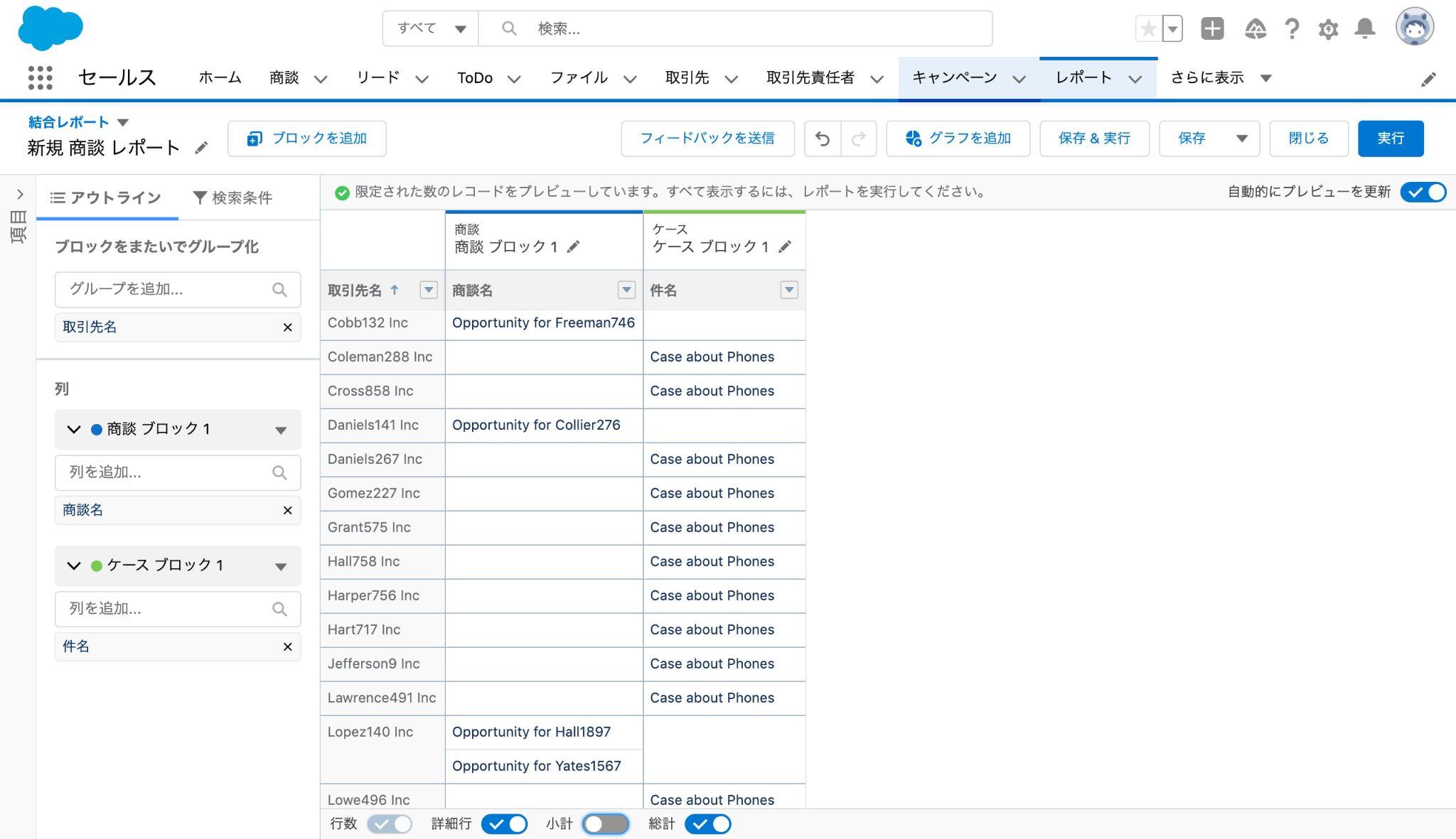 以上の操作で「商談」と「ケース」のレポートが結合して、1つのレポートとしてグループ化されます。