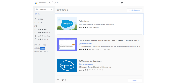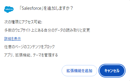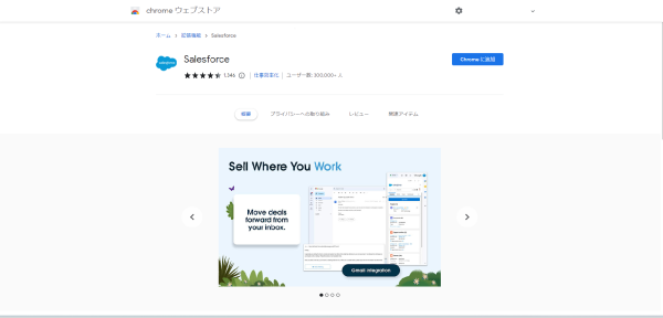 - 「ストアを検索」ボックスに「Salesforce」と入力し、Salesforce 拡張機能を選択の上 [Chrome に追加] をクリック