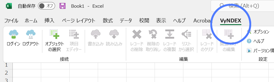 アドインをインストールするとExcel上にVyNDEXのタブが表示され、Salesforceへのログイン、対象データの「読み込み」を行ないます。