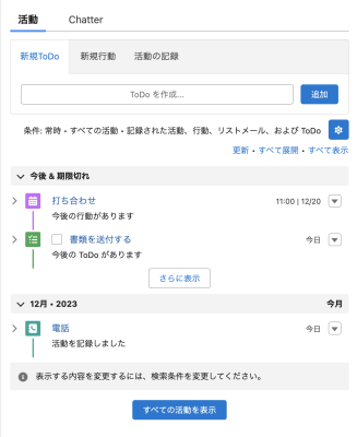 ちなみに、登録したToDo・行動は活動コンポーネントのタイムラインで一覧で確認が可能です。