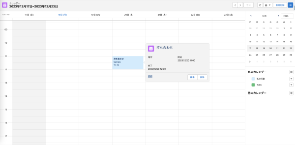 例えば「A社との打ち合わせを、12月1日の10:00から11:00までサンブリッジオフィスで実施する」といった情報を登録できます。