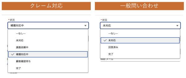 ステータスやカテゴリなどの選択リスト項目も、レコードタイプごとに表示する値を制御できます。たとえば、「クレーム対応」では「未対応/調査依頼中/補償対応中/顧客確認待ち/対応完了」などの選択肢を用意し、「一般問い合わせ」では「未対応/回答済み/対応完了」など、異なる選択肢を表示することが可能です。