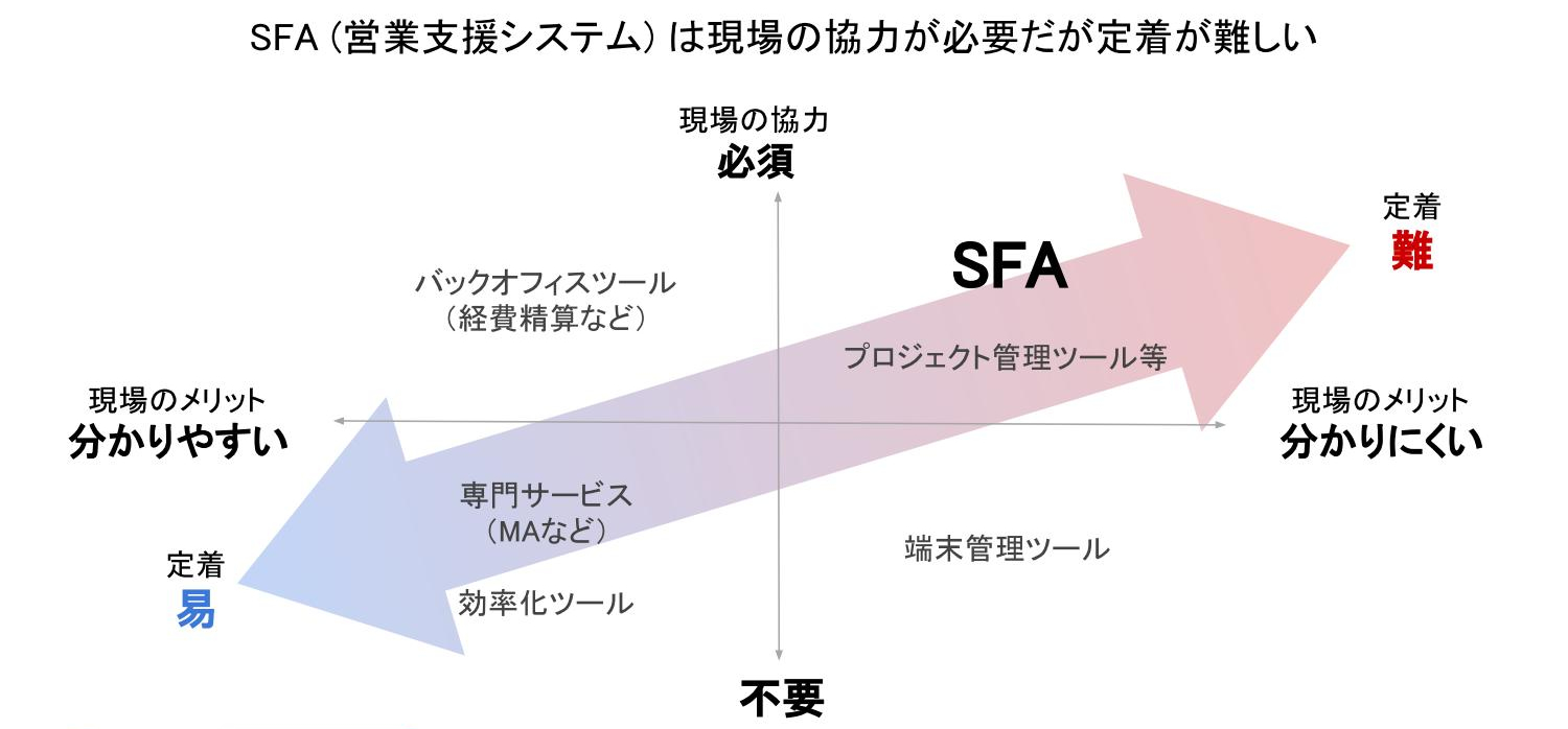 木本: よくこの図を使っているんですが、入力してくれないのは Salesforceというよりも、SFA(営業管理システム)の問題だと思っています。