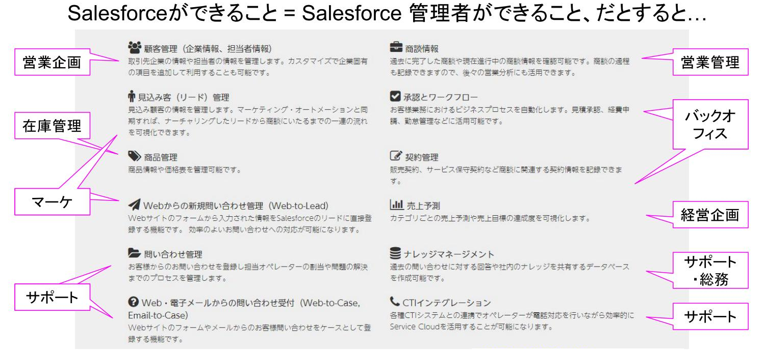さらに、システム管理者は、新入社員が入ったり移動する度にSalesforceの研修までやっていることが多いんです。でも研修や教育はすごく時間が割かれるところなんです。なので、そういうところは現場でSalesforceを詳しい人が教えられるようにするとか、他の人でもできることは協力してもらうとか、そのような方法を取られていることが多いです。