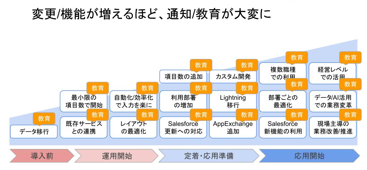 木本:「組織」への拡大です。活用が進んでSalesforceでできることが徐々に増えていくと、結局やることも増えていきます。また、Salesforce自体がどんどん進化しているので、Saleforceに関わった人は、それぞれ新しいことを学ばないといけないんですね。ある意味、新しい機能が増えると、また新たな機能の定着・活用フェーズが来るようなものです。