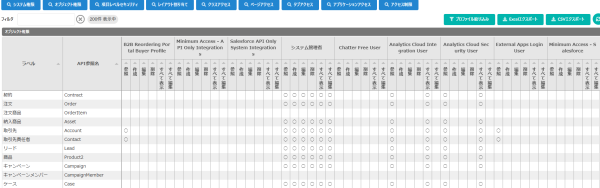 - 各プロファイル/権限セットのアクセス権を一覧で表示が可能。