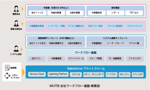 2020年のコロナ禍において、MUTBでは喫緊の課題となった押印を必要とする紙ベースの帳票の承認フローを在宅での業務に対応すべく帳票電子化プロジェクトを立ち上げ、わずか3か月の期間でSalesforceを基盤としたワークフローシステムを構築し、半年で約1,500種の帳票のペーパーレス化を実現した。しかし、同社で約30年もの間、銀行業務で利用されてきたレガシー業務ワークフローをクラウド時代に即した形に移行することは大きな課題であった。