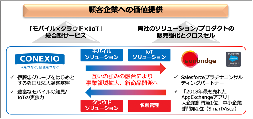 コネクシオは、伊藤忠グループをはじめとする強固な法人顧客基盤を有し、モバイルソリューションの提案に強みを持っています。今回、サンブリッジの名刺からはじめるコンタクト管理サービス『SmartVisca』の販売拡大パートナーである同社との連携を強化することで、同商品の業界シェアの圧倒的向上を狙います。SmartVisca導入企業に対しては、Salesforceを活用した、CRM、SFA、MAといったクラウドソリューションを提案し、より先進的な顧客管理へとステップアップすることも可能になります。さらに、コネクシオの持つIoT/エッジコンピューティング技術に、サンブリッジのクラウドインテグレーション力を合わせ、センシング技術によって取り出したデータを、AIで分析し、Salesforce上に可視化することで、営業・マーケティング戦略への活用、資産・資源の利活用、経営判断などに活用できる仕組みの提供が可能になります。