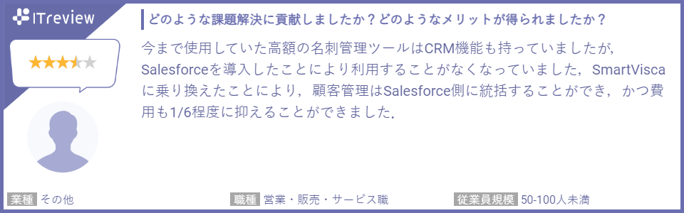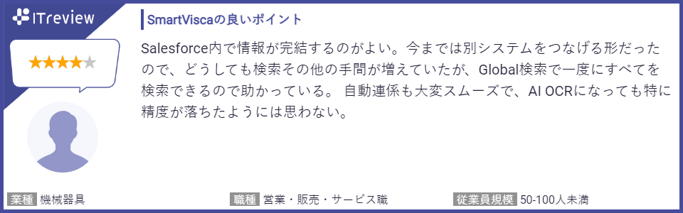 投稿されたレビューでは、スキャナーやスマートフォンで名刺をスキャンし、デジタル化する過程で使用されるOCR(光学文字認識)の精度と速度に満足しているといった点や、他社名刺管理からSmartViscaに切り替えて名刺管理コストを大幅に削減できた点、さらにSalesforceとのデータ連携の効率の良さを高く評価する声を多くいただいております。