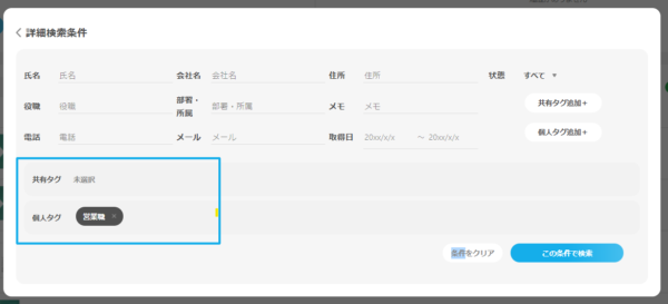 検索の条件として「共有タグ」や「個人タグ」を指定できるほか、社名や部署などの属性情報だけでなく、さまざまな条件を組み合わせることで詳細な検索が可能になります。