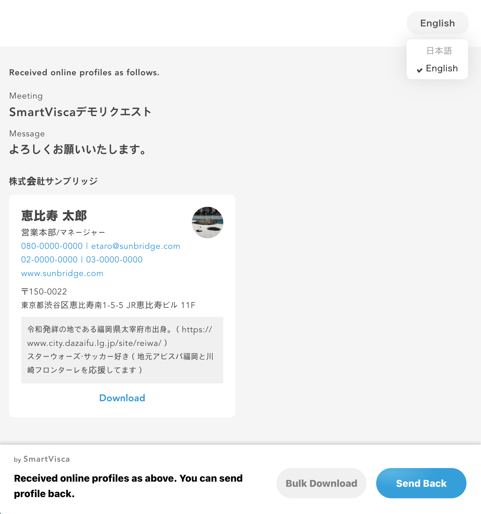 SmartVisca オンライン名刺受信画面: 画面上で手動での言語切り替えも可能