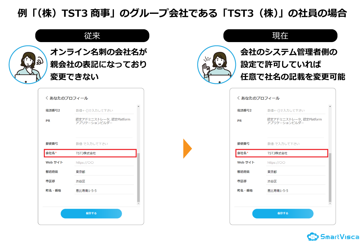 グループ企業でSmartViscaをご利用いただいている企業様から「会社名の欄を親会社名ではなく自社で変更できるようにしたい」といったご要望にお応えし、SmartVisca管理者側で変更許可の設定を行うことでユーザが自身のプロフィール編集画面から会社名項目を任意で設定いただけるようになりました。