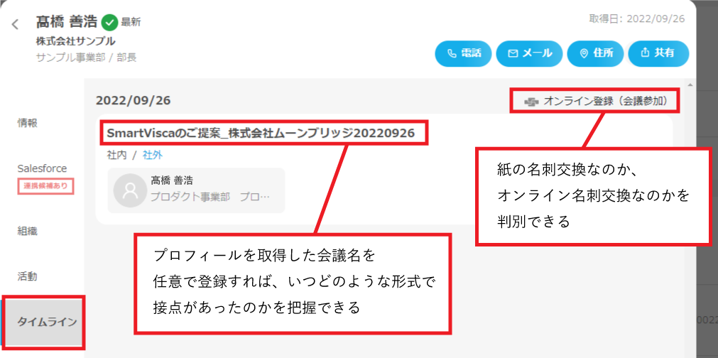 すでにSmartViscaで提供している「つながり」と「社外プロフィール取得履歴」の両機能を統合。顧客と名刺交換をした社内メンバーと当時の名刺データを紙の名刺、オンライン名刺などのデータソースタイプごとにタイムライン形式で表示します。