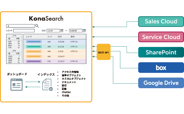 KonaSearchは、AI技術を利用した自然言語検索やマッチングエンジンにより、Salesforce内の取引先などのオブジェクト、項目、ファイル、画像、ストリームなどあらゆるデータに加えて、Google DriveやSharepointなどの外部のデータソースも対象とした共通のインデックス化行うことで、データ容量に関わらず高速な検索を実現します。