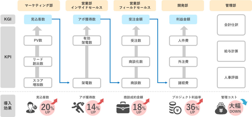 現場のリソースも含めた営業計画や予実管理を行うことで案件の成約率を向上。メンバーの稼働にあわせたプロジェクト管理により利益率が担保され、管理部門でのコスト削減とあわせて、全体的な利益率の向上につながりました。