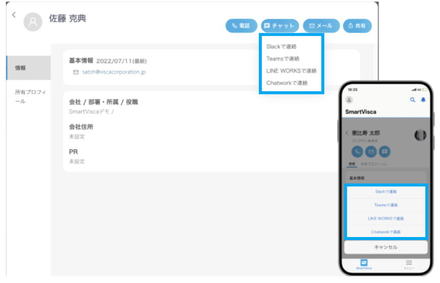 対象顧客の「社外プロフィール」画面の「つながり」に該当する従業員情報が表示され、すぐにメールやチャット、電話で連絡を取ることができ、コミュニケーションを効率化します。