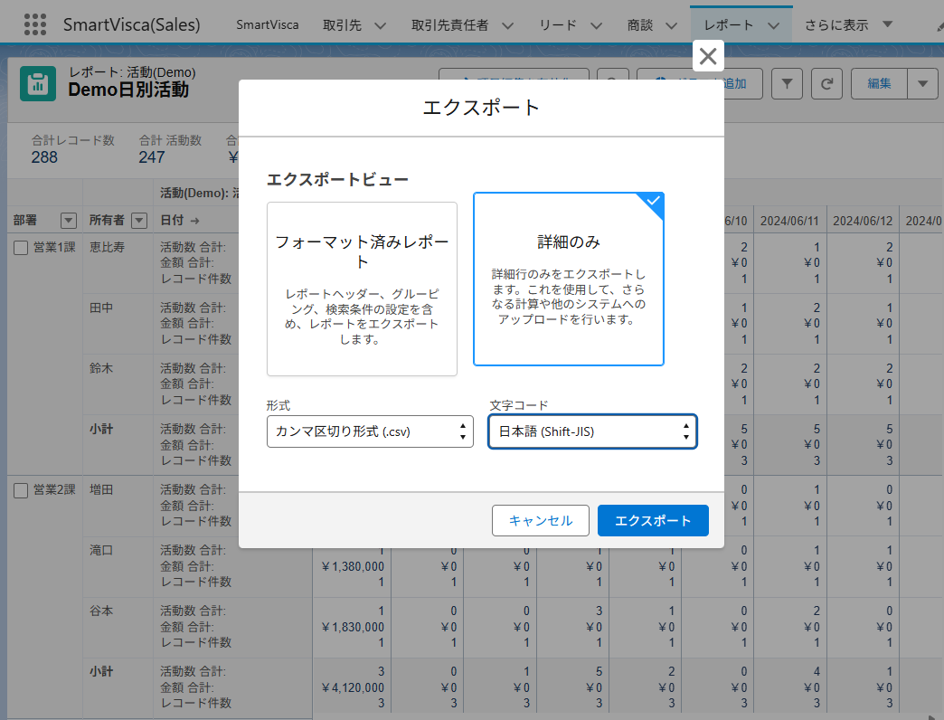 レポート機能で生成した一覧は、Salesforce上で新規登録・更新されたデータが即時反映されるため、営業アプローチのリストやマーケティングメールの配信などに活用できます。必要に応じてcsvで出力も可能です。