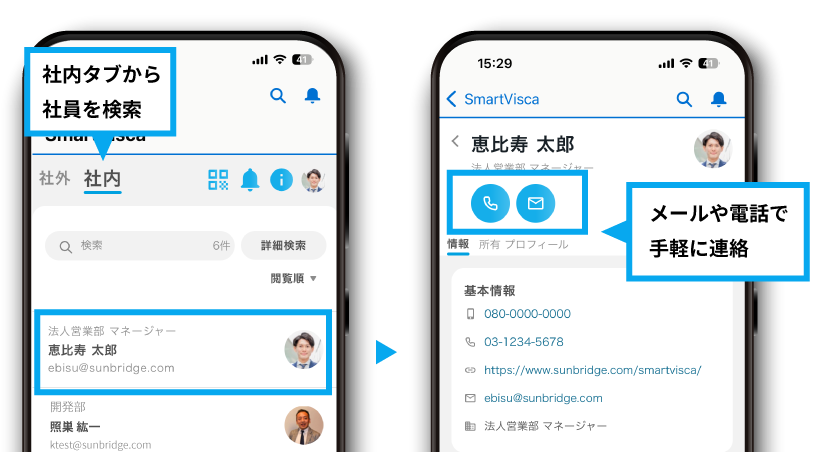 相手の姓・名などで名刺を検索し、メールや電話ですぐに連絡を取れるので、出先で相手の連絡先が分からず戸惑ってしまうといったことも防ぐことができます。