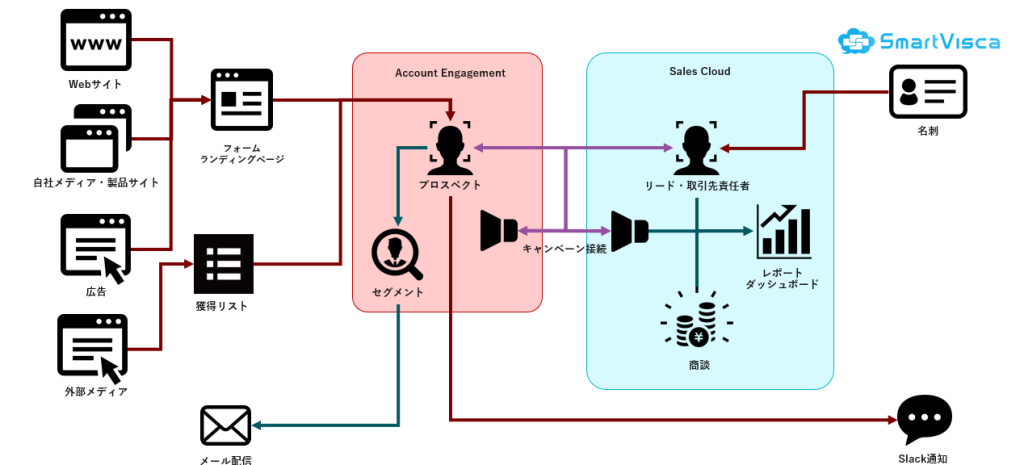 SmartViscaで取り込んだ顧客情報は、Salesforceの標準オブジェクトを介してセールスフォース・ジャパン社が提供するMA(マーケティングオートメーション)ツールであるAccount Engagement(旧Pardot)をはじめとする各種システムと連携し、メール配信の母数を効率的に増やすことができます。