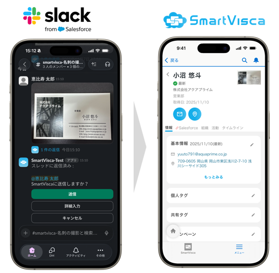 SalesforceのアプリからSmartViscaにアクセスし、モバイルのカメラで名刺を撮影します。(iOS/Android対応)
